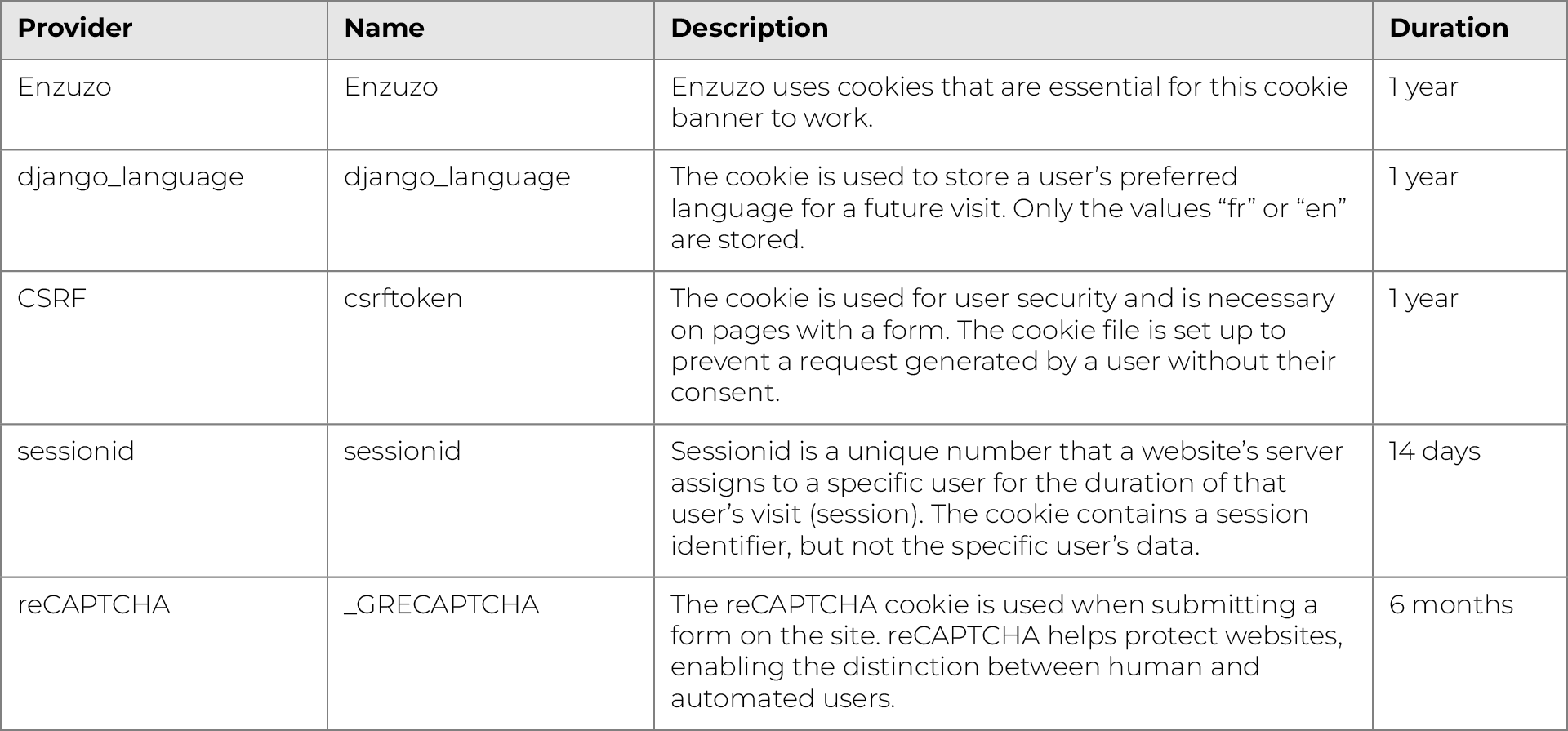 We use two types of cookies: (i) a language cookie that remembers your choice of language for the website (i.e. English or French) for the purpose of your next visits; (ii) cookies related to the use of Google Analytics on our website. Google Analytics uses first-party cookies to report on visitor interactions. These cookies are used to store non-personally identifiable information, such as what time the current visit occurred, whether the visitor has been to the site before, and what site referred the visitor to the web page. A description of the Google Analytics cookies can be found at: http://www.google.com/analytics/learn/privacy.html